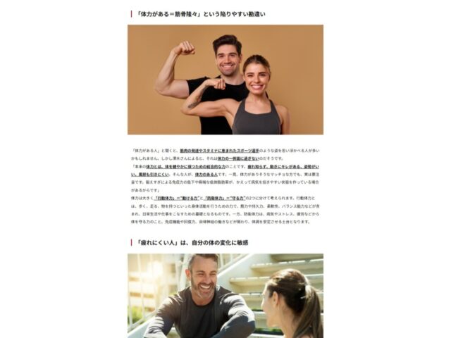 特に、弊社が提唱している「行動体力」と「防衛体力」の両方を高める、という考え方をベースに、日常生活における体力の活かし方を紹介しています。