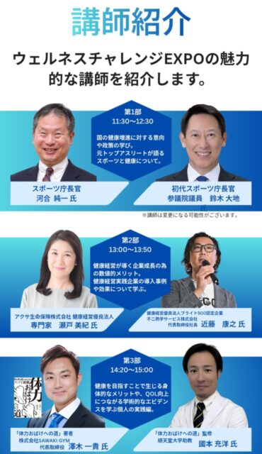 本イベントは、公益社団法人東京青年会議所が主催し、スポーツ庁の協力のもと開催される、企業の経営者・役員・管理職・人事担当者を対象とした健康経営・ウェルネス施策の実践型エキスポです。